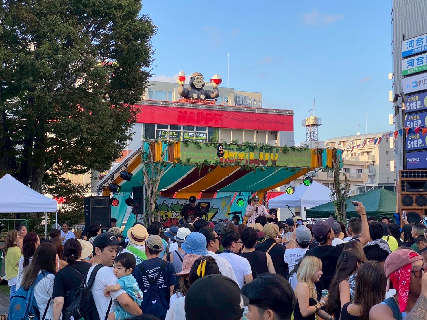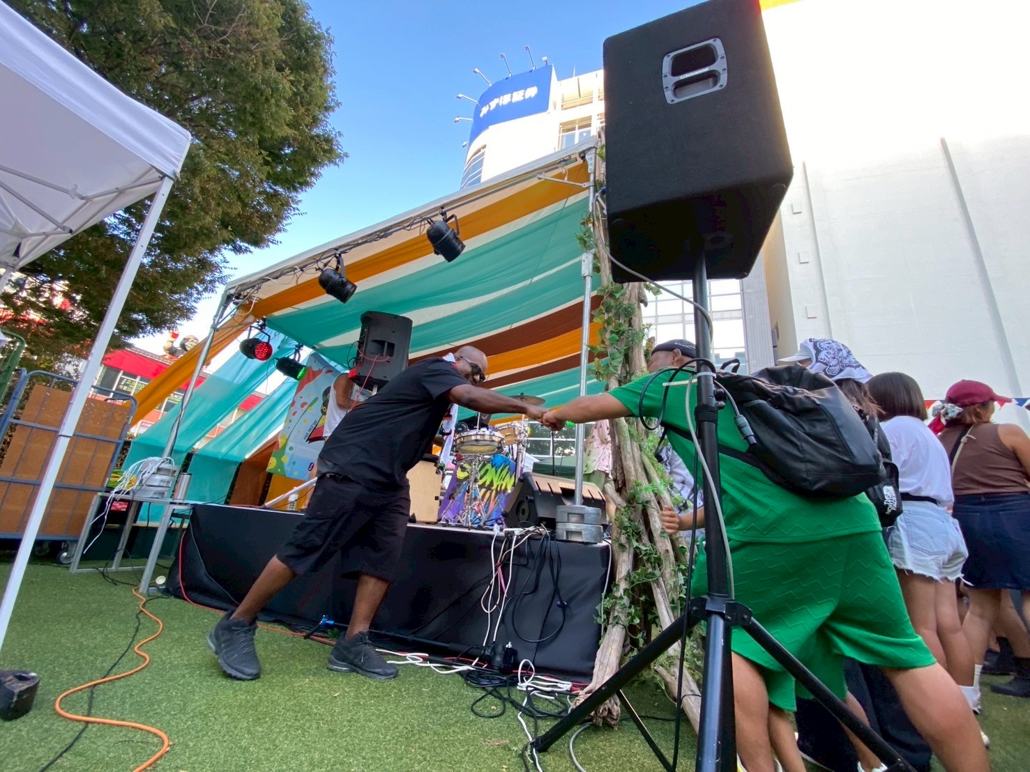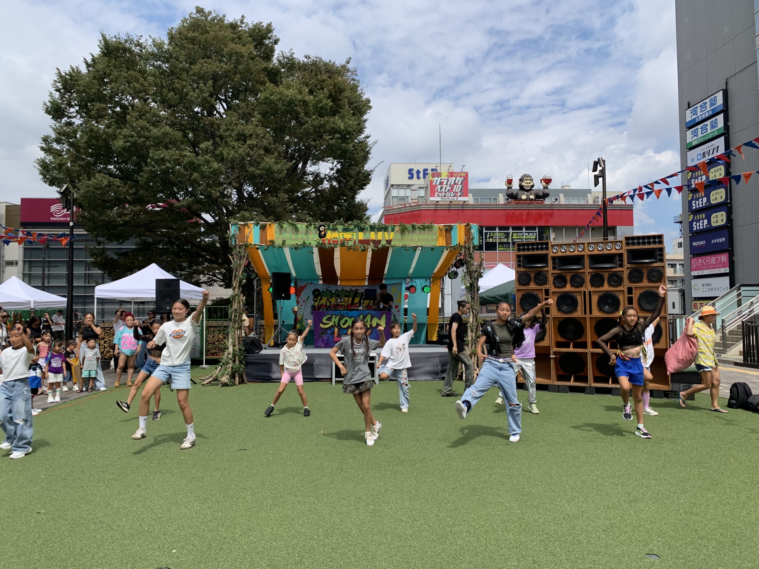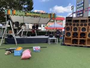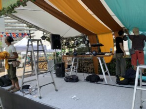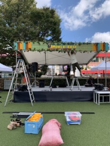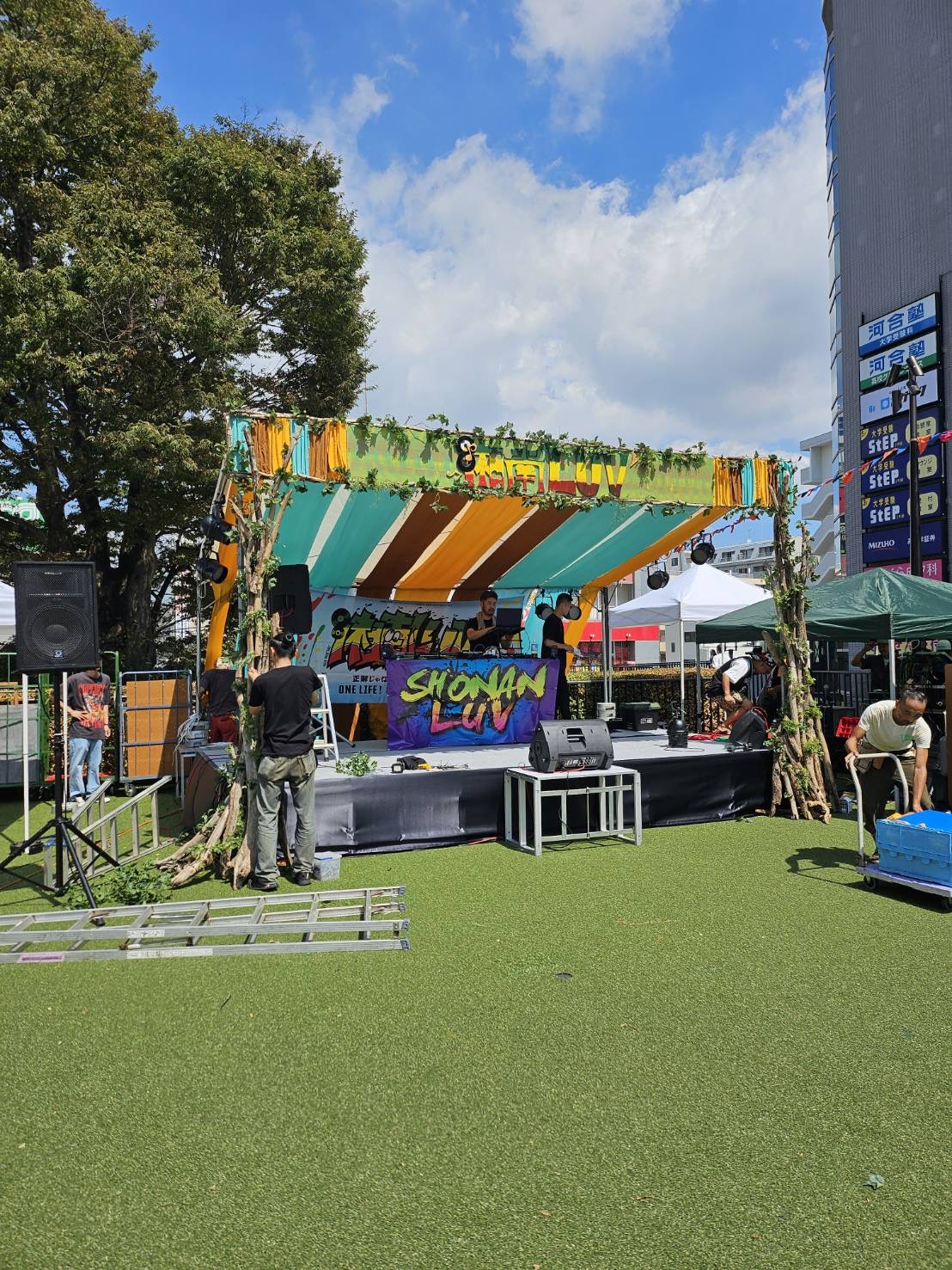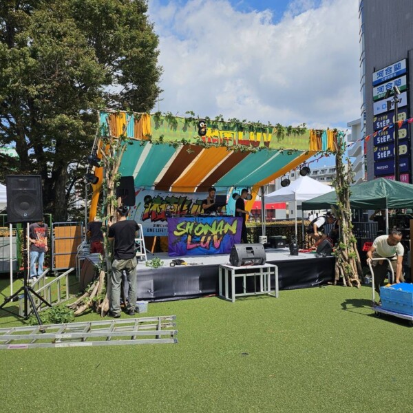 湘南Luv 2025 藤沢駅前サンパール広場 ガーランド装飾 ステージ装飾ステージの寸法に合わせてデコレーションのイメージを固めて行きます。 ステージに予め用意しておいた部材を取り付けて行きます。 reggaeのイベントなのでラスタカラーを基調に海や夏を連想させる様な色合いを起用しました。 ステージのセンターから左右対称に布を張って行きます。 イベントのバナーをステージ中央に設置します。 子供達のダンス リハーサルが始まりました。 柱に流木を付けてナチュラルなテイストを出しました。多くのお客様がご来場してくださいました。 ガーランドも設置しました。 1 2